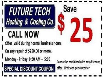 $25.00 off any HVAC repair (parts & labor) on any HVAC repairs over $250.00 or higher. Excludes $25.00 savings off of $90.00 diagnostic fee during regular business hours. Offer valid during regular business hours only 8 AM-5 PM. Monday-Friday. Also excludes $25.00 savings off of EMERGENCY after-hours diagnostic service call fee of $130.00.